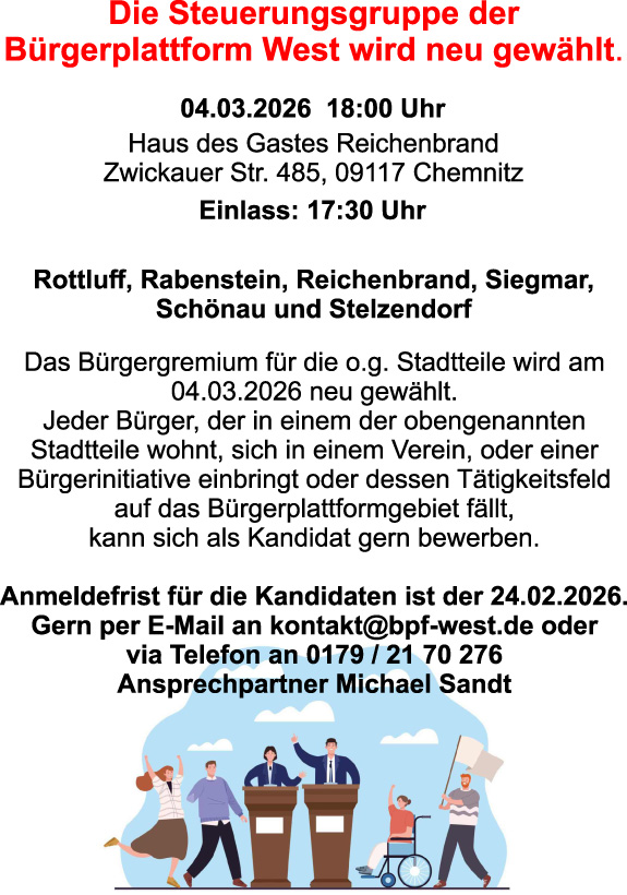 Das Bürgergremium für die o.g. Stadtteile wird am 04.03.2026 neu gewählt. Jeder Bürger, der in einem der obengenannten Stadtteile wohnt, sich in einem Verein, oder einer Bürgerinitiative einbringt oder dessen Tätigkeitsfeld auf das Bürgerplattformgebiet fällt, kann sich als Kandidat gern bewerben.